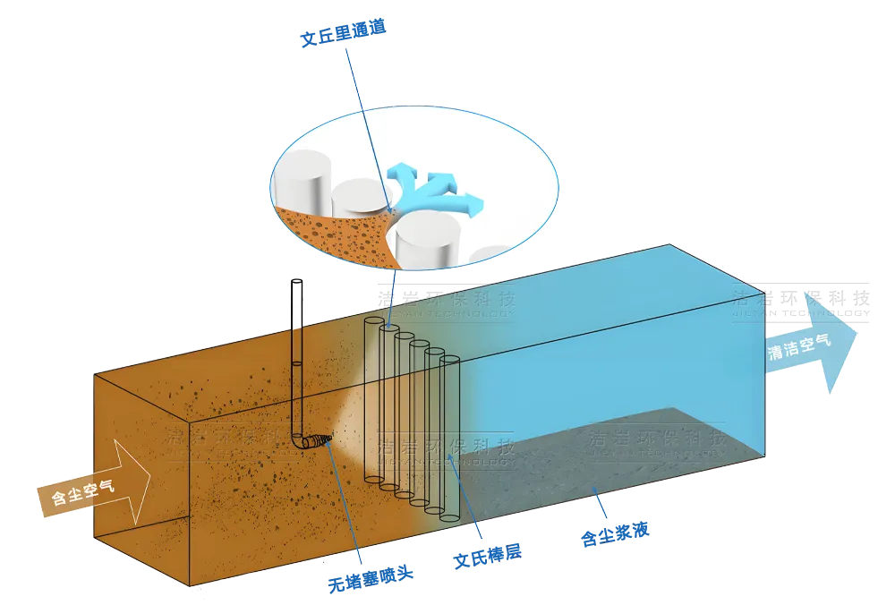 MDC系列内部增设文氏棒层,将进风均匀分割为多条较小文丘里通道。气体匀速通过时压力损失极低,同时多而小的通道充分强化文丘里效应,显著提升除尘效率,实现了高效除尘与低空气阻力的理想平衡。