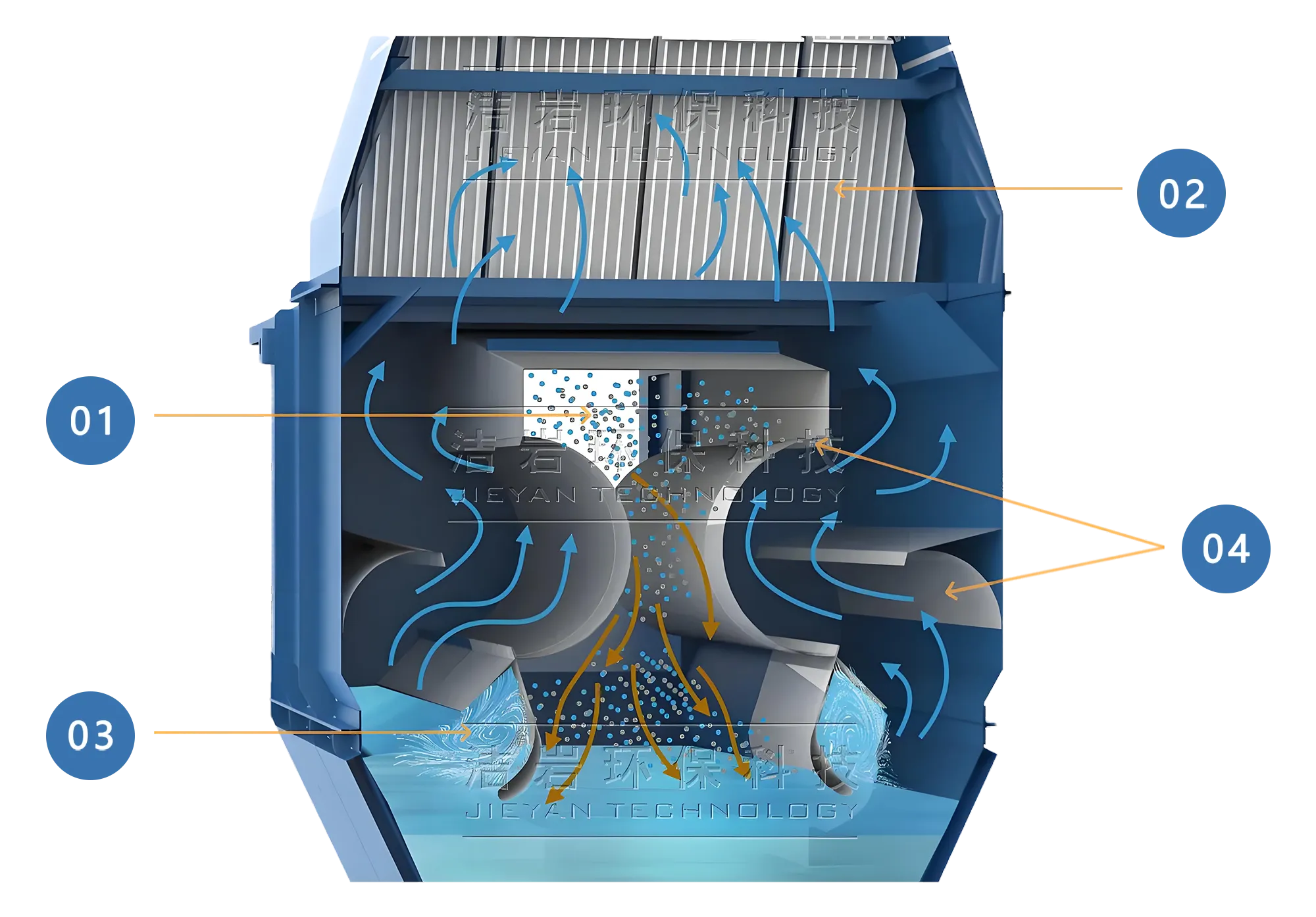 配备超大箱体与低于1.5米/秒的除雾区风速,有效提升除雾效率。三层弧形挡板设计兼顾流体特性,脱水率高、阻力小,全程无丝网与折板,彻底杜绝堵塞隐患。