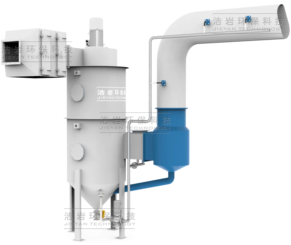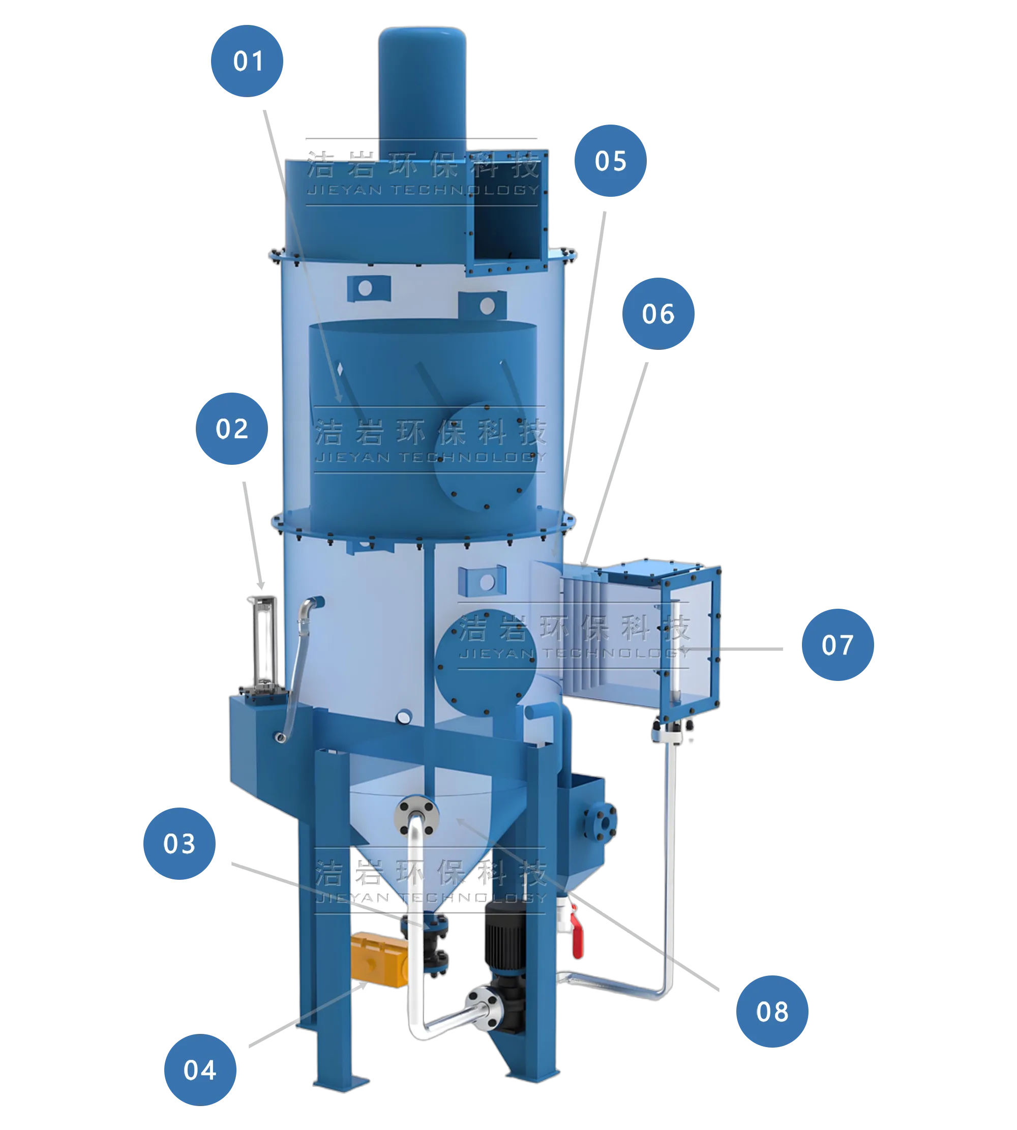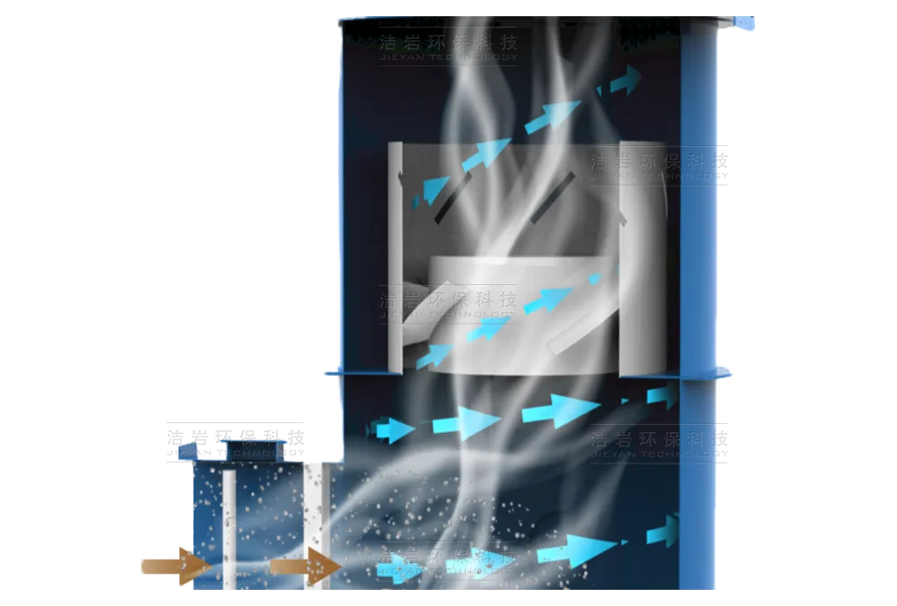 第一重利用切向进风产生离心力,使较重含尘液滴下沉。第二重采用独特双层旋流装置,有效隔离脱除的水雾与上升气流,防止液滴二次夹带,确保脱水除雾效率最大化。