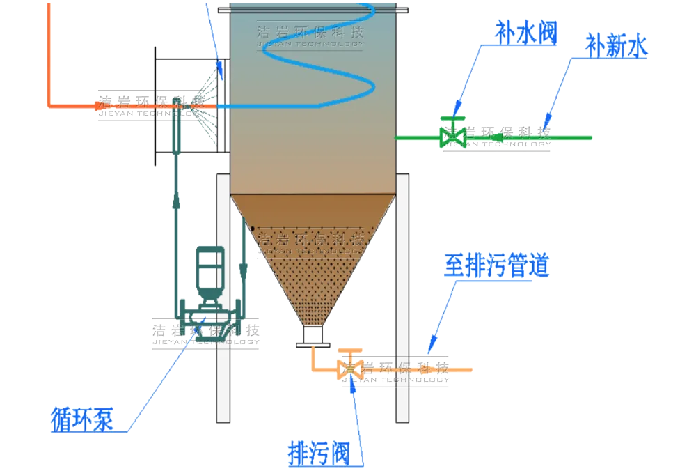 MDC-V系列实现除尘水循环使用。粉尘沉淀后由锥底排出,澄清水经304不锈钢污水泵再次喷淋至喉口,无废水外排。专用污水泵耐颗粒磨损,运行稳定可靠。