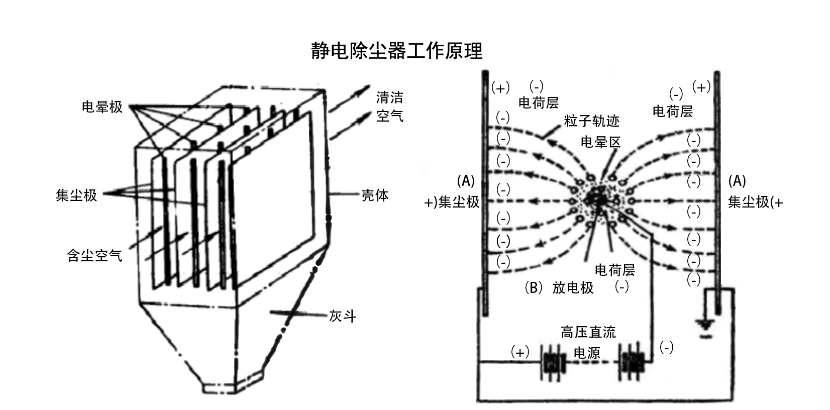 一般的静电除尘器采用荷电电场和分离电场合一的方法,放电极的金属棒接高压直流电源的负极,集尘极接地为正极,集尘极可以采用圆管,也可以采用平板。接通电源后,在电场作用下,空气中的自由离子要向两极移动,电压愈高、电场强度愈高,离子的运动速度愈快。由于离子的运动,极间形成了电流。开始时,空气中的自由离子少,电流较少。电压升高到一定数值后,放电极附近的离子获得了较高的能量和速度,它们撞击空气中的中性原子时,中性原子会分解成正、负离子,这种现象称为空气电离。空气电离后,由于连锁反应,在极间运动的离子数大大增加,表现为极间的电流急剧增加,空气成了导体。放电极周围的空气全部电离后,在放电极周围可以看见一圈淡蓝色的光环,这个光环称为电晕。电除尘器的电晕范围通常局限于金属棒周围几毫米处。空气在电晕范围电离后,正离子很快向负极移动,只有负离子才会进入电晕外区,向阳极移动。 含尘空气通过电除尘器时,由于电晕区的范围很小,只有少量的尘粒在电晕区通过,获得正电荷,沉积在电晕极上。大多数尘粒在电晕外区通过,获得负电荷,最后沉积在阳极板上,当尘埃聚集到一定程度,由于重力作用,掉下聚集到收集槽内。